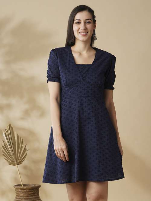 - » globus women navy blue self-design v-neck puff slevee flared hem ethnic dress