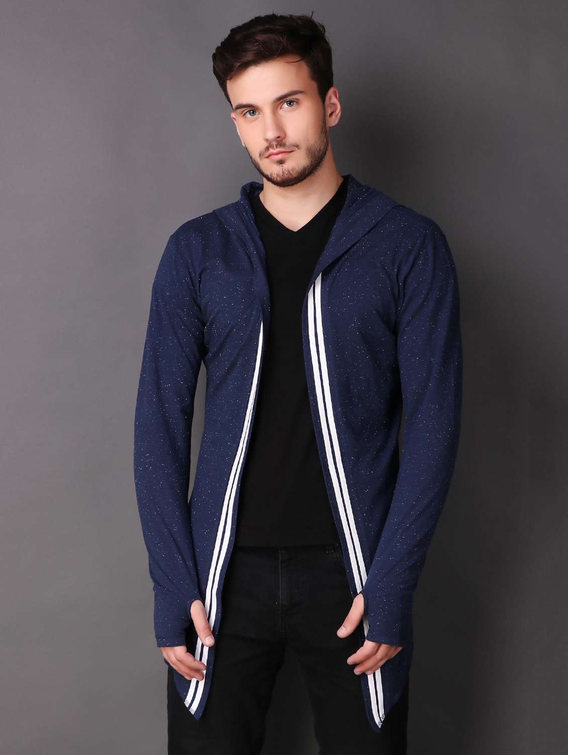 Le & SWAN navy blue color solid open front regular longline hooded shrug, has long sleeves, assymetric hem. A fashinable trending premium shrug design with new look by LE & SWAN to enrich the best life style along with new generation. Fabric 100 Cotton
