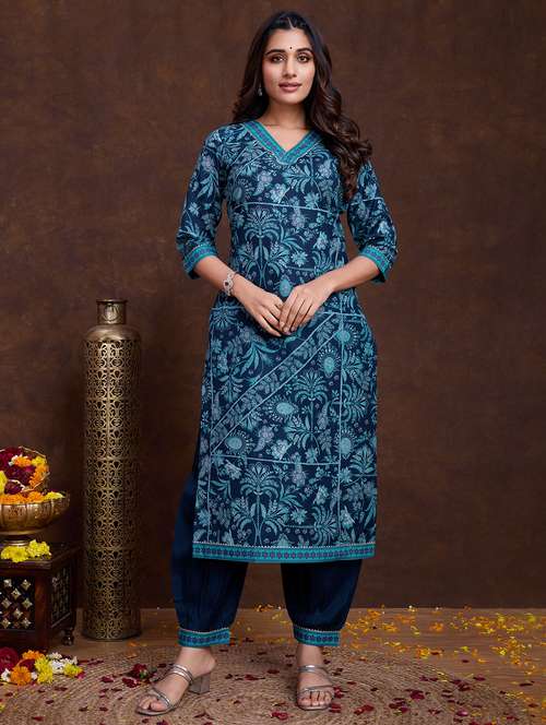 - » women blue floral v neck kurta salwar set