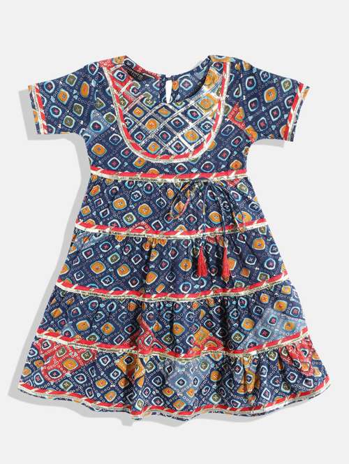 Tiered Cotton Fabric Navy Blue Color Print Dress with gotta work at Neck & Bottom
