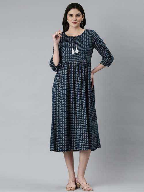 - Dress up in a soothing pattern and don this dress made of cotton material.