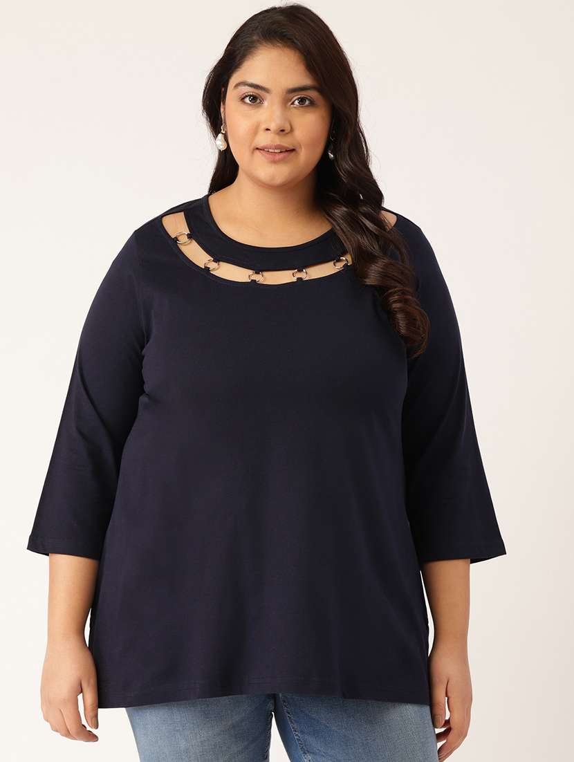 theRebelinme Plus Size Women's Navy Blue Solid Color Cotton Knitted embellished detail top, has a round neck, 3/4th sleeves and curved hem.