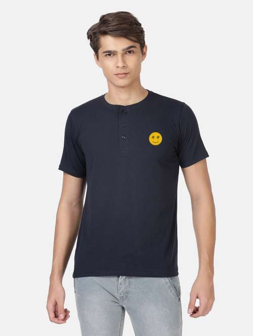 - » navy blue chest-printed t-shirt