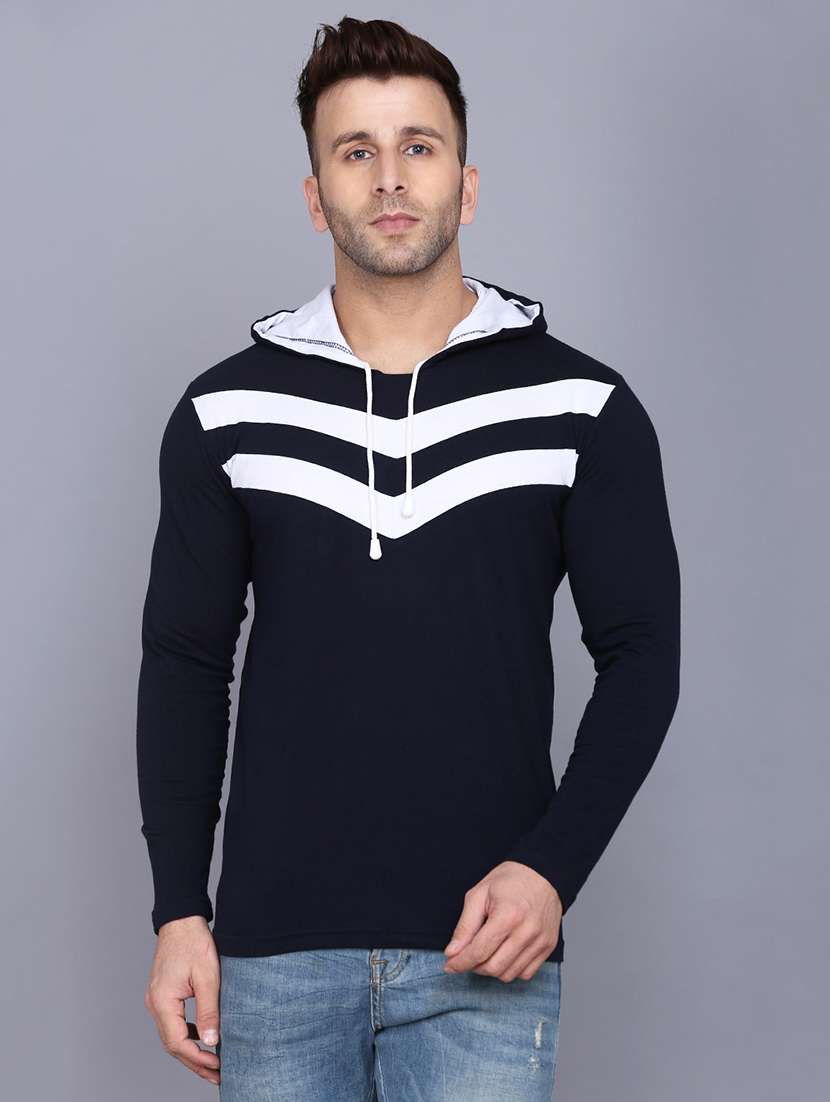 - » navy blue color block cut & sew hooded t-shirt