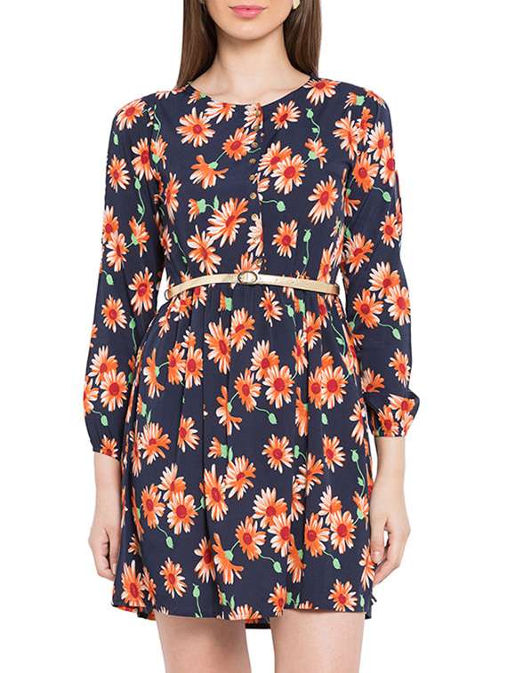 navy blue crepe floral print belted dress