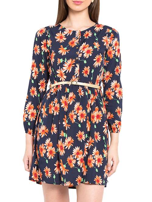 - » navy blue crepe floral print belted dress