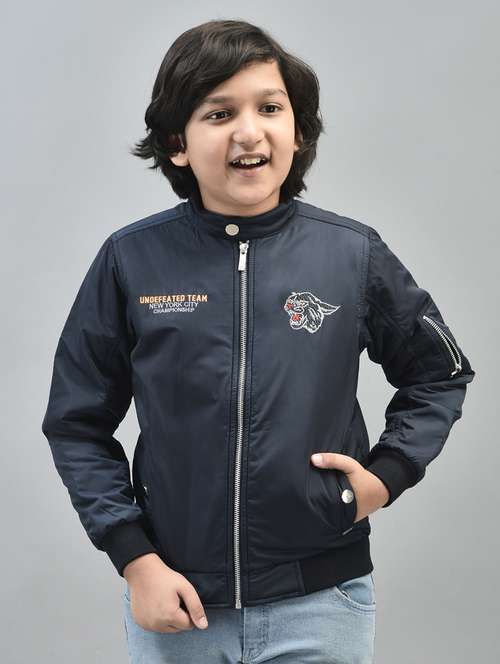 - » boys navy blue typographic full sleeve bomber jacket