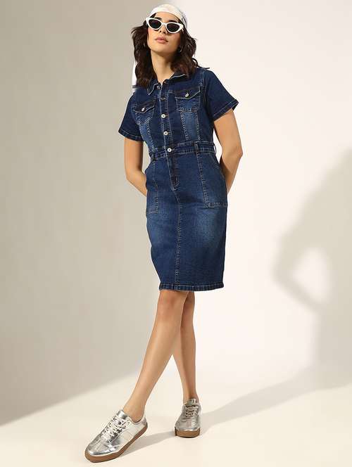 - Dress up in a soothing pattern and don this dress made of denim material.