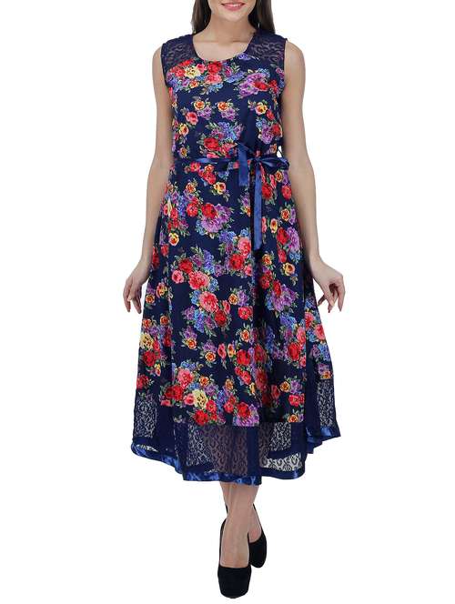 - » navy blue floral printed georgette fit & flare dress