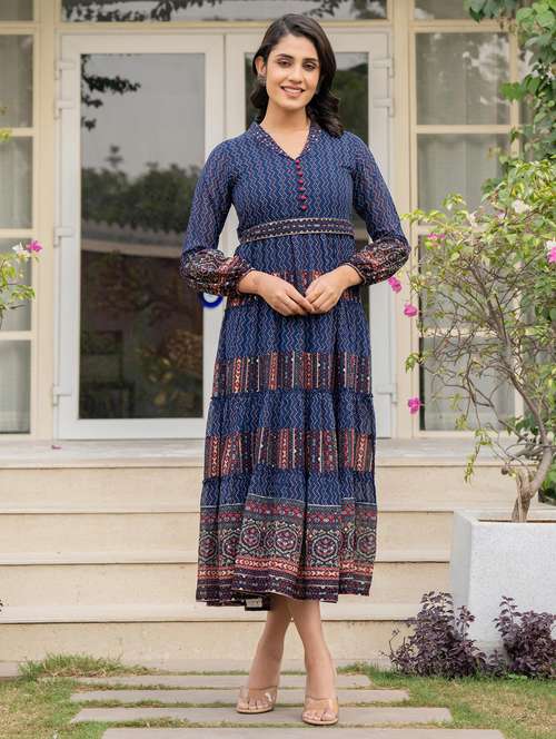 women navy blue printed v neck tiered dress - 21679187 - Very Small Image - 1