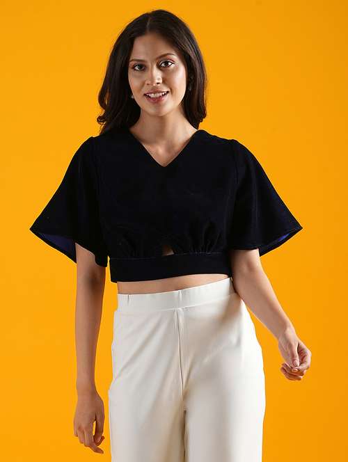 globus women navy blue v-neck flared sleeves cut out detail velvet party crop top