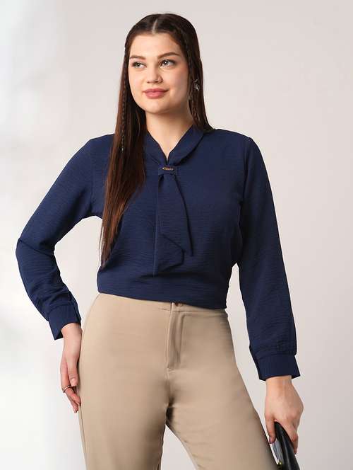 - » globus women navy blue tie-up neck cuffed sleeves workwear top