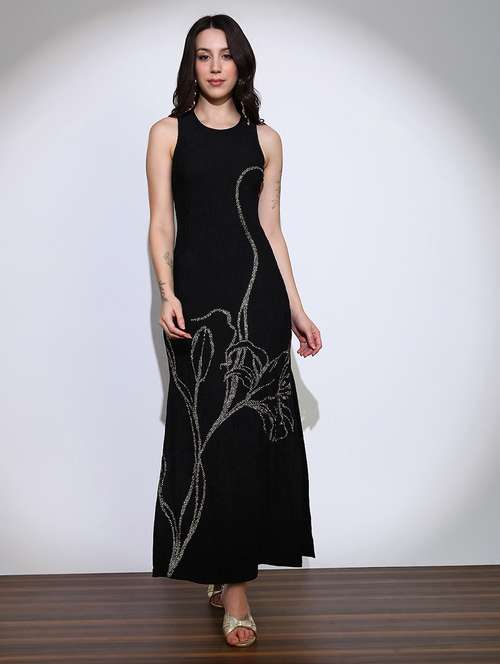 - » globus women navy blue self design round neck embellished detail side slits bodycon maxi party dress