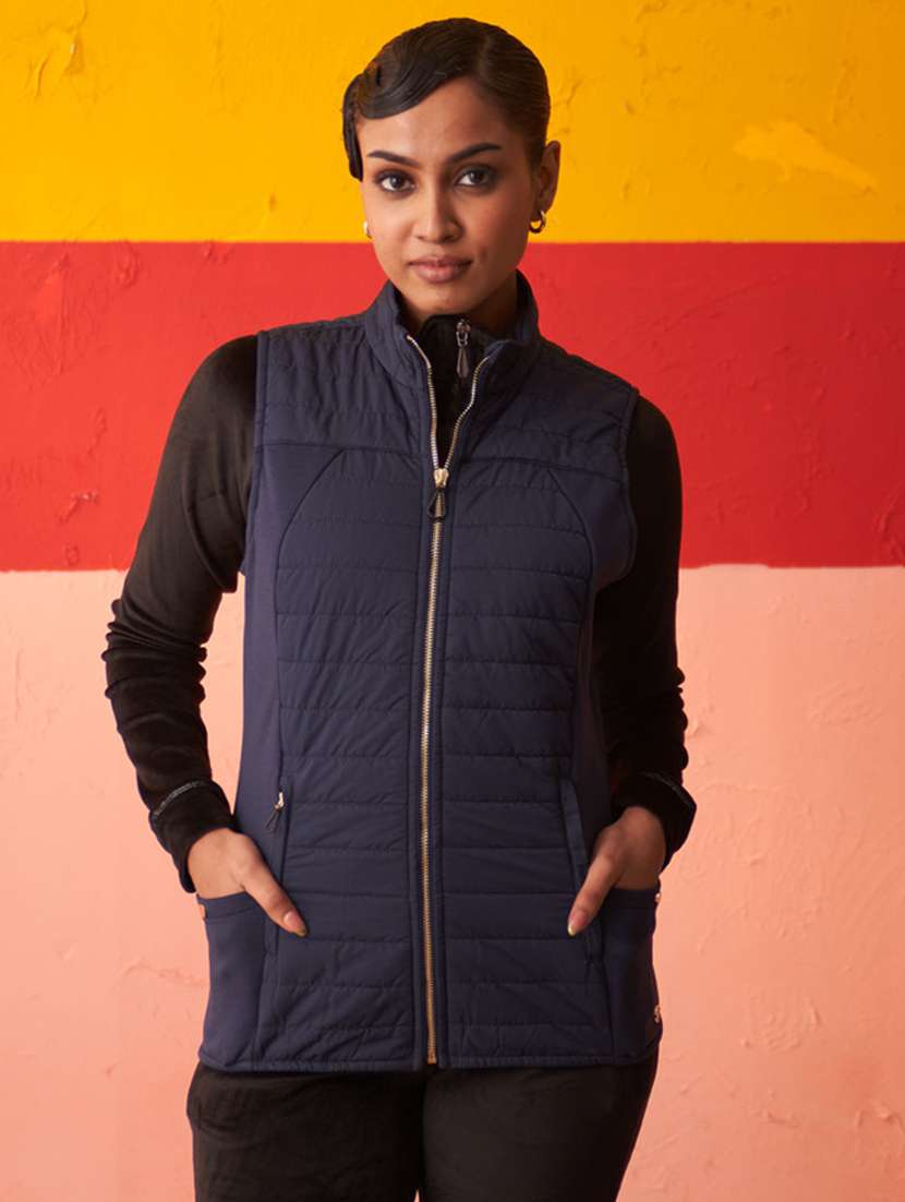 - » women solid sleeveless quilted jacket