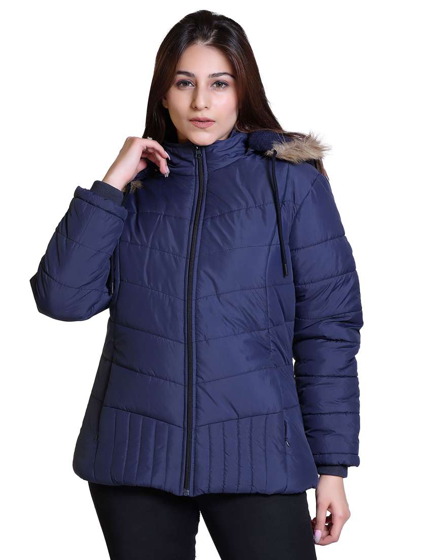 - » women navy blue nylon quilted hooded jacket