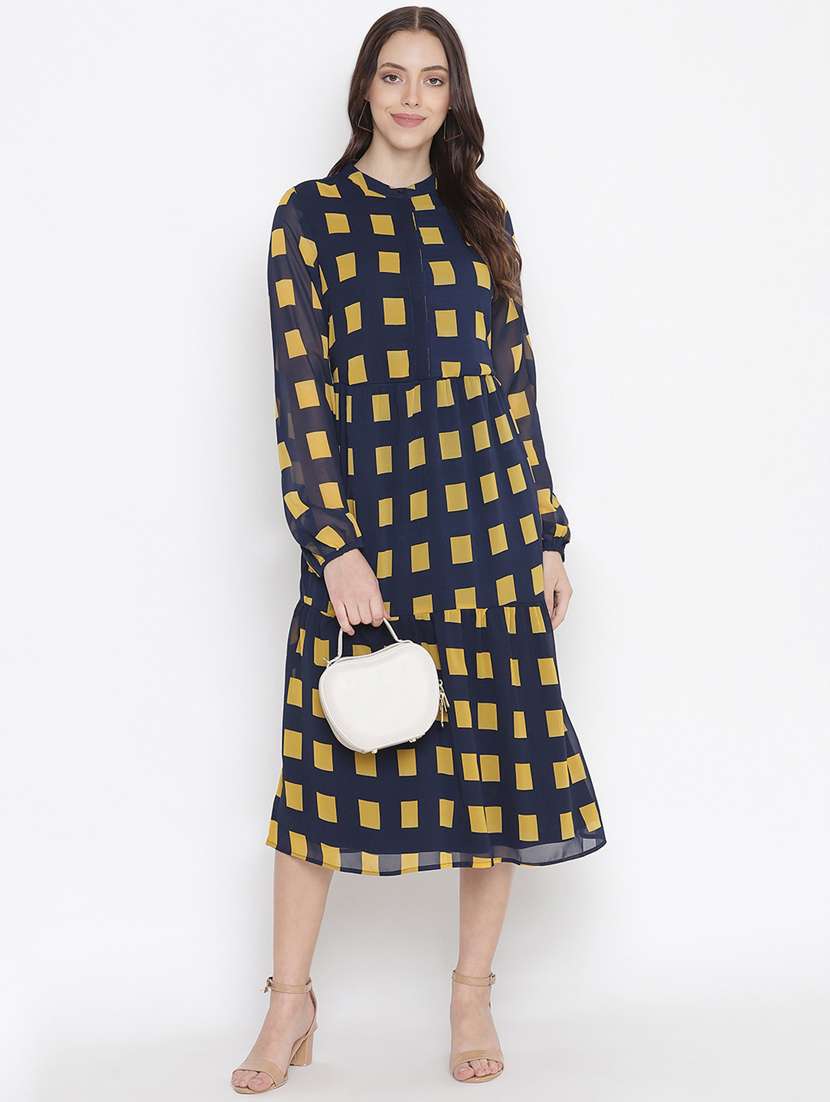 - Dress up in a soothing pattern and don this dress made of polyester material.