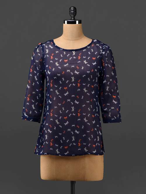 - » navy-blue printed sheer chiffon top