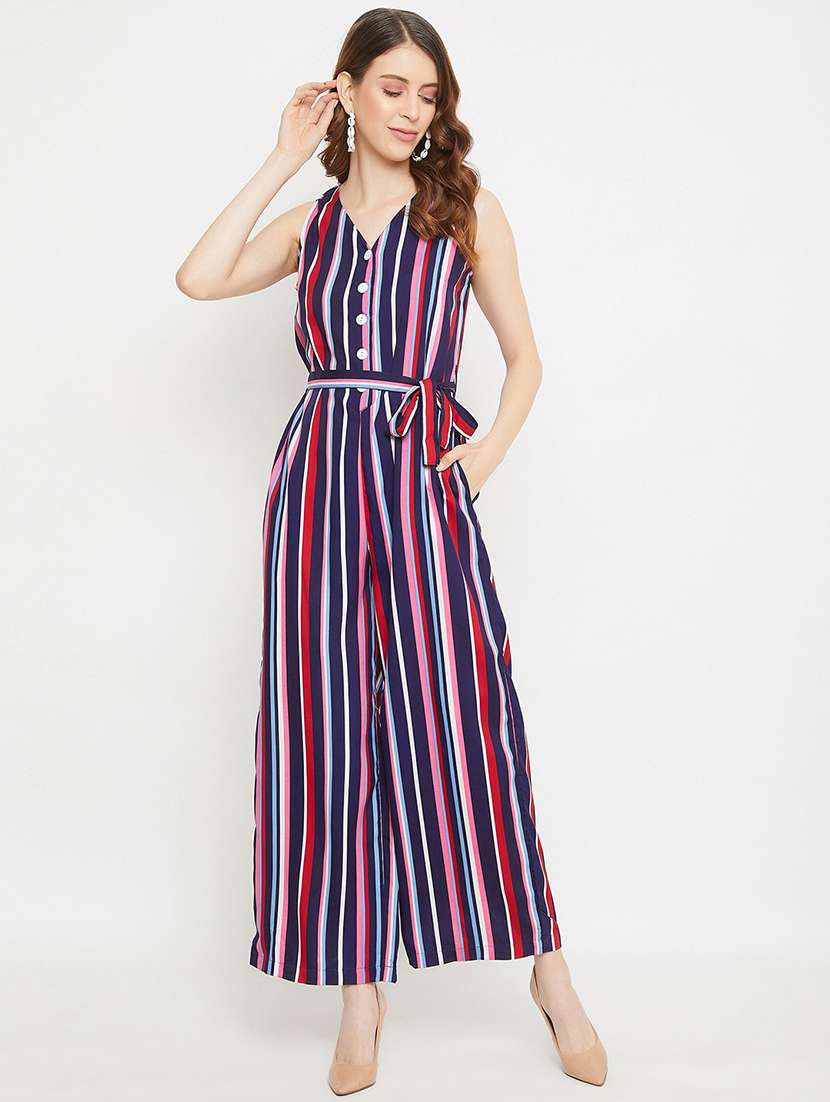 - » tie front striped full leg jumpsuit