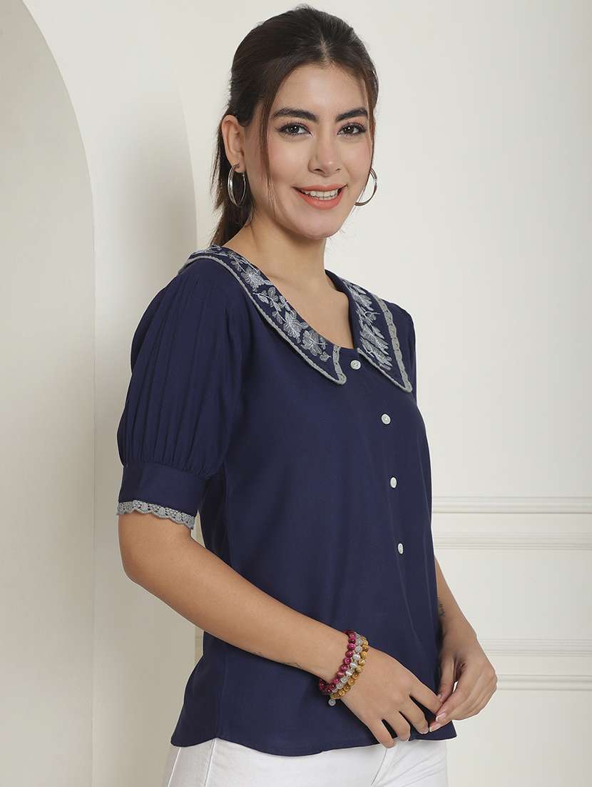 - » navy blue embroidered detailed shirt style top