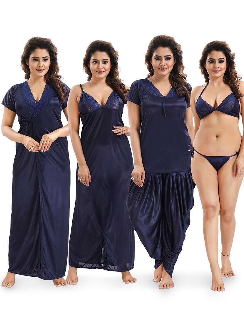 Make your nights sexy & stylish with this 6 Piece Nightwear Set (1 Robe, 1 Nighty, 1 Top, 1 Patiyala, 1 Lingerie Set).Made up of Satin.The Nighty, has lace chest panel with adjstable shoulder straps & elastic details at the back for perfect fit.