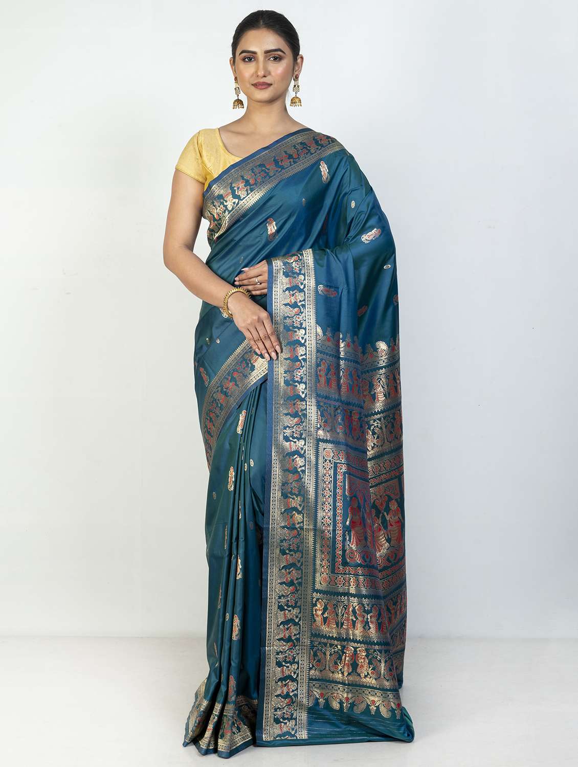 BORDER DETAILS: Ornate golden zari border with detailed ethnic patterns and traditional figurative designs