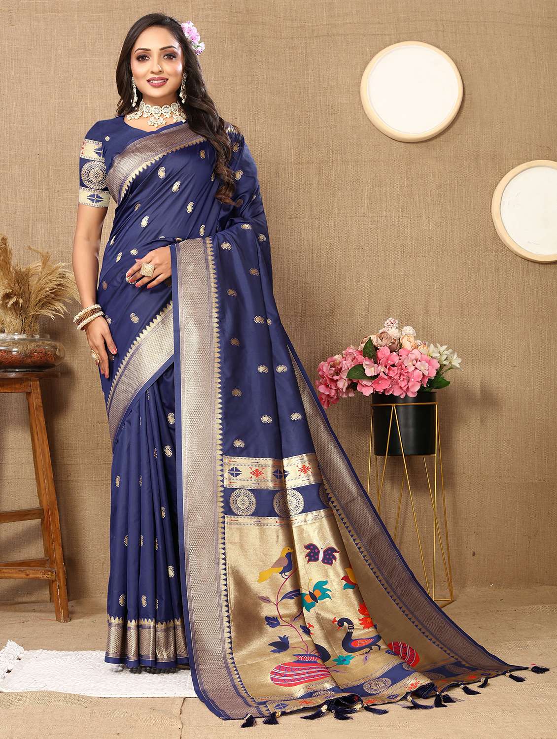 Soft Pathani silk saree with zari weawing motifs design and Meenakari weawing Rich pallu with Meenakari weawing border & Tassels attached at Pallu end. Blouse :- Enrich silk weawing contrast blouse piece with sleeve border ,