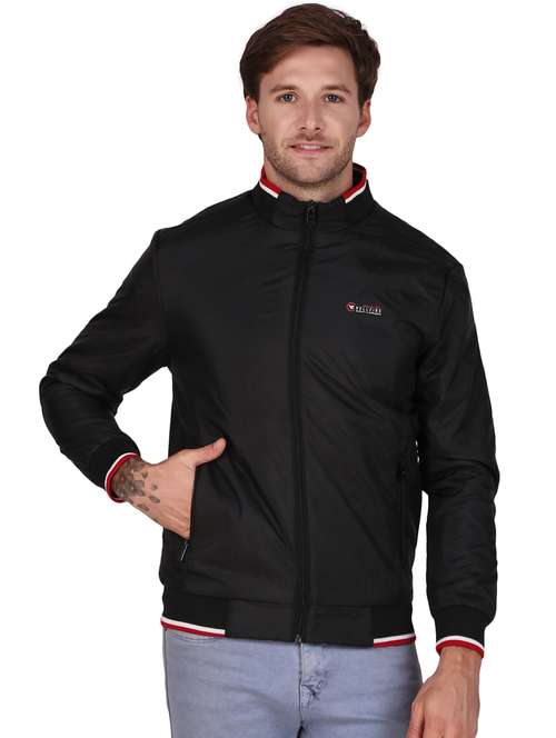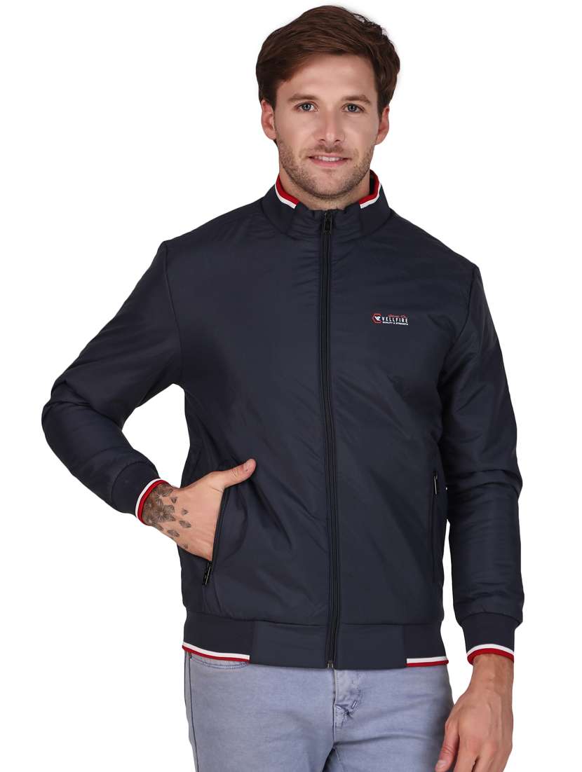 - » men solid navy blue polyester casual jacket