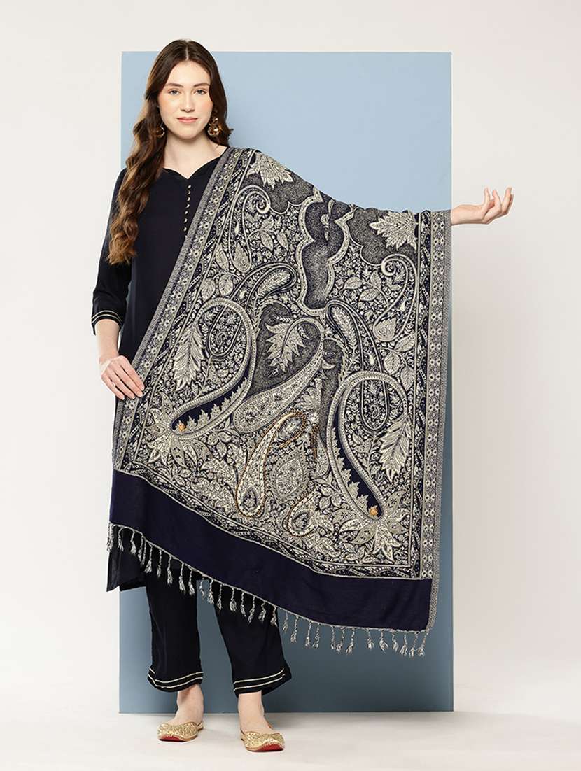 - Add navy blue colors to your winter collection with the comfortable variety of shawls made of wool blend materials starting at ₹799 price range.