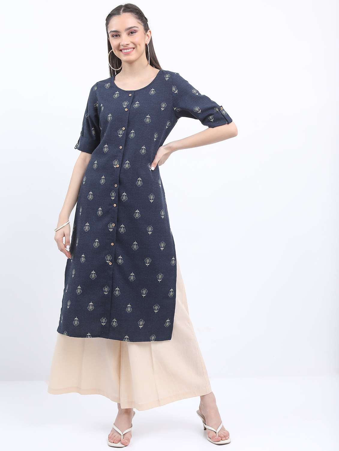 - Grab this beautiful kurta made up of cotton blend fabric featuring round neck designs.