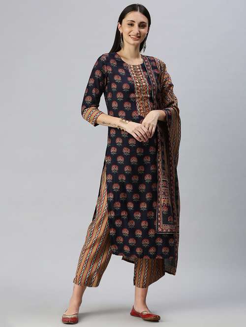 - » women navy blue printed kurta pant set with dupatta