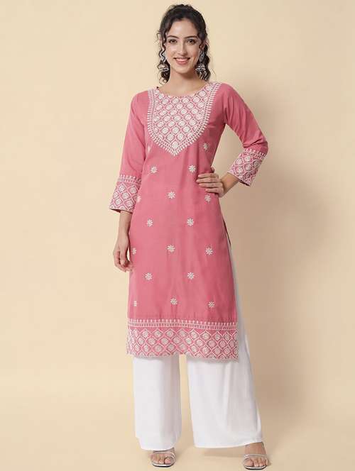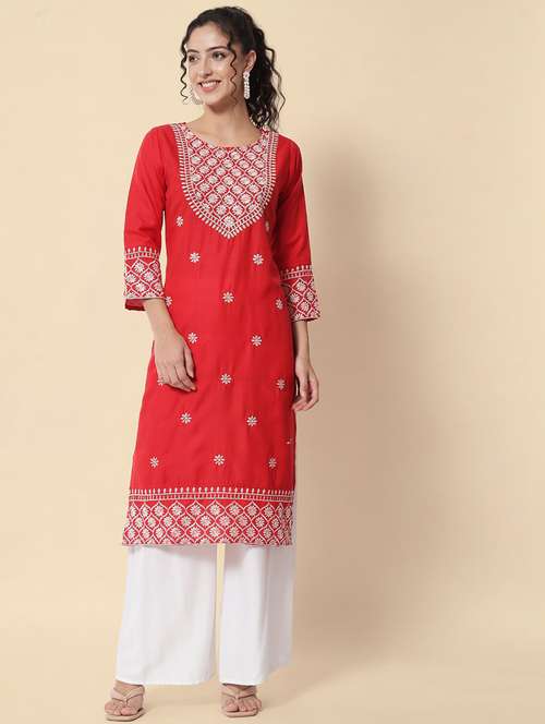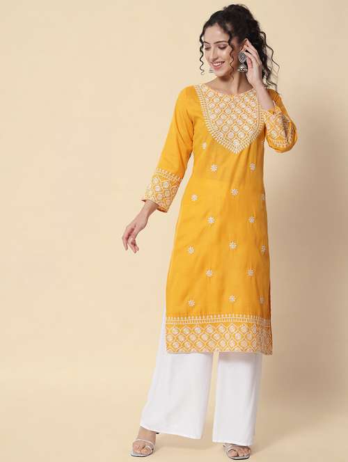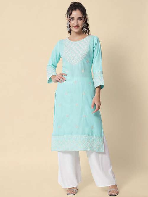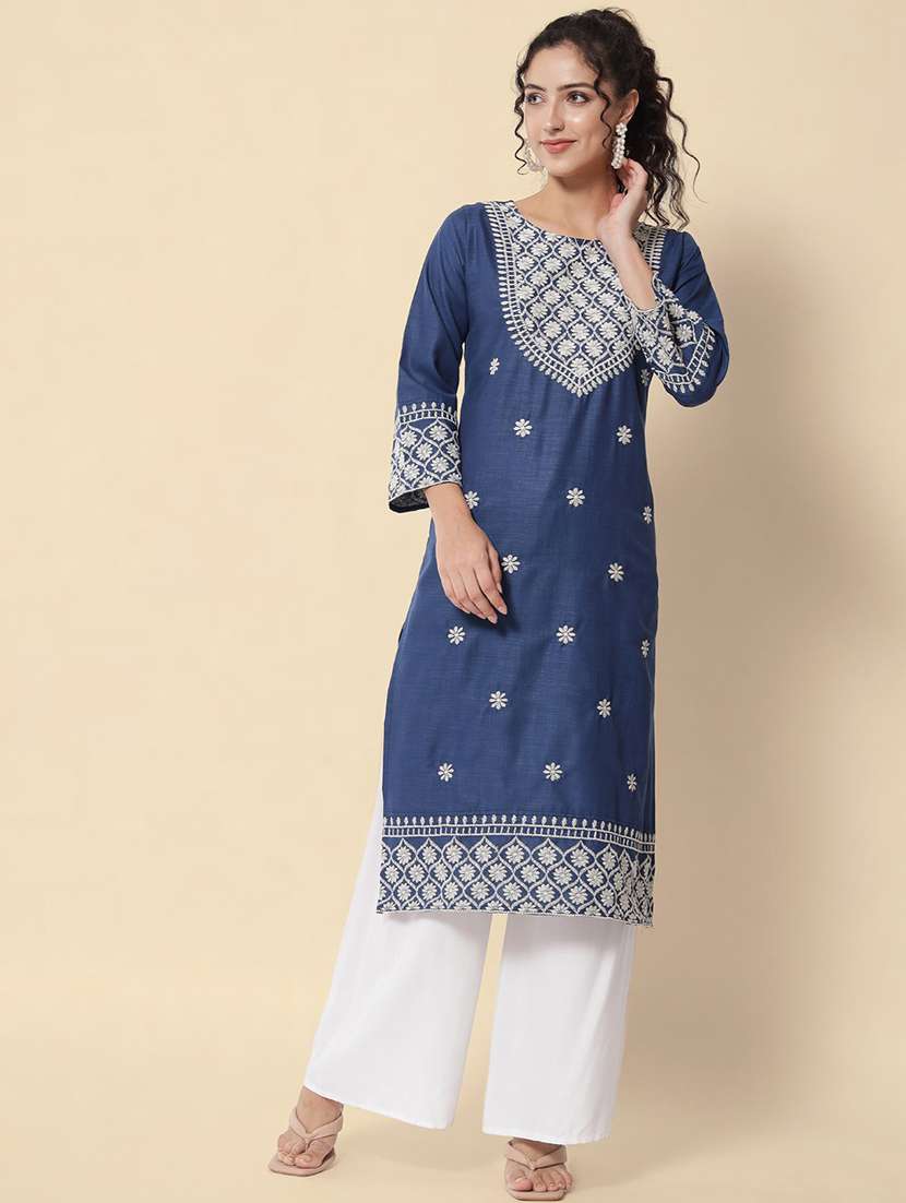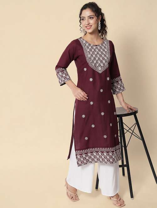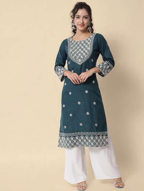 - Grab this beautiful kurta made up of cotton blend fabric featuring round neck designs.