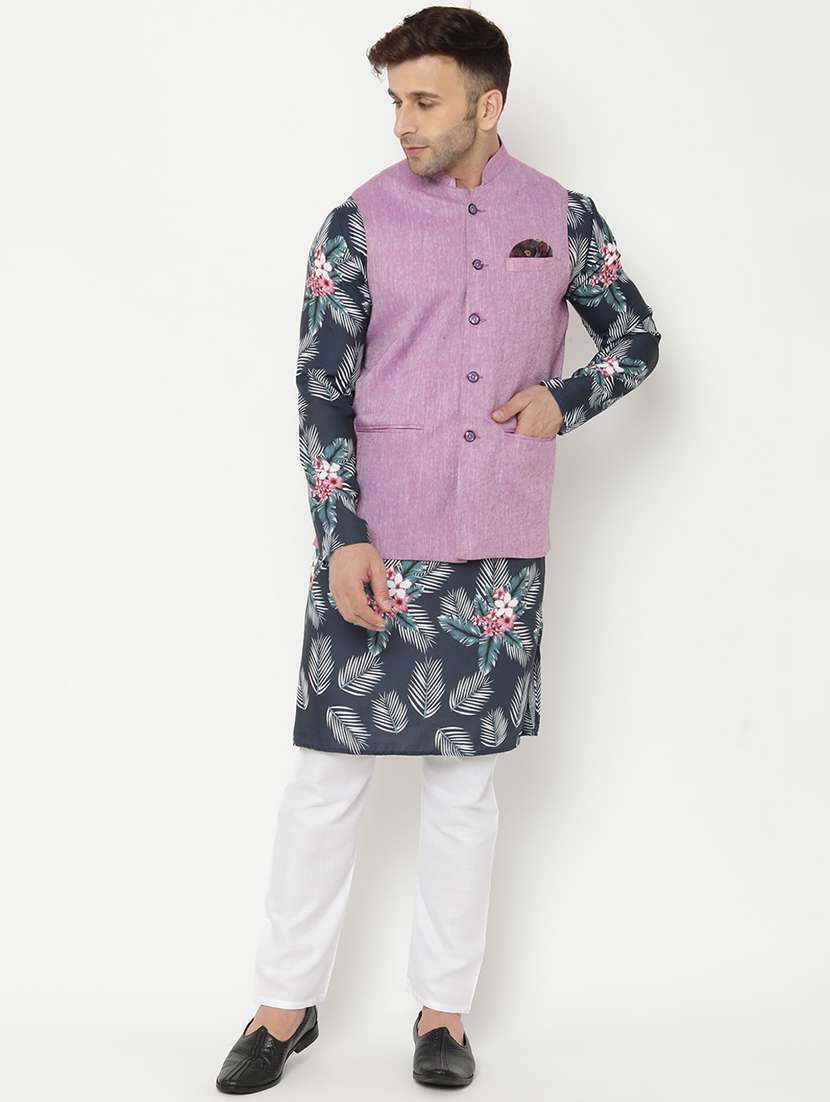 navy blue printed kurta pyjama set with purple solid nehru jacket