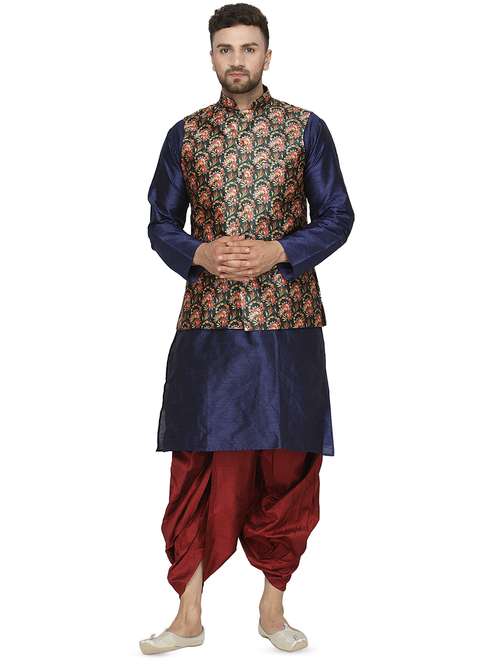 navy blue dupion dhoti kurta set with nehru jacket