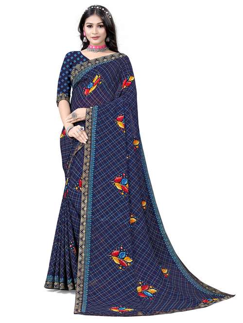 women's printed navy blue colored saree with blouse