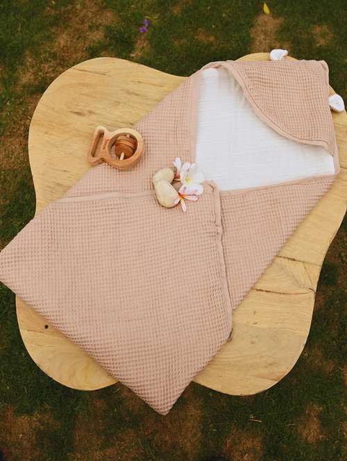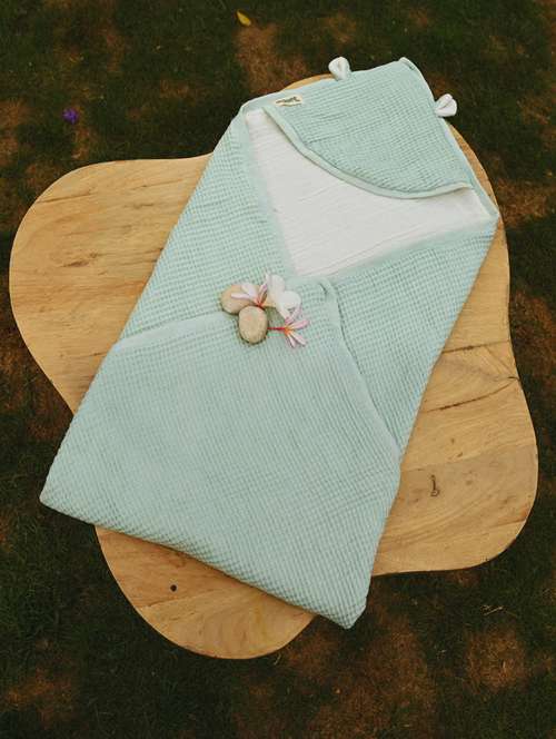 Aangan’s Mint Green Baby Towel brings the comfort of a mother’s lap to bath time. Crafted with a dual-layer design—extra-soft waffle cotton on the outside and breathable muslin on the inside—this towel is absorbent, feather-light, and baby-friendly. Ideal for newborns up to 12 months, it turns every splash into a moment of joy and warmth.