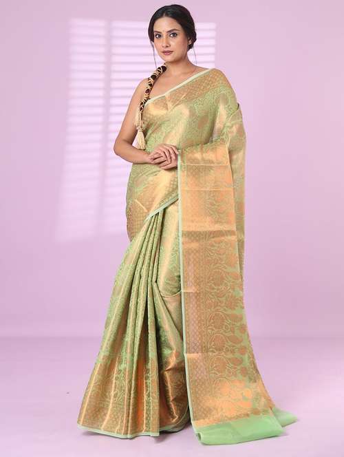 Add intricacy to your look in this light green handwoven brocade silk saree. It has a zari woven ethnic pattern all over the saree. The borders and pallu have ethnic designs to complete the look.