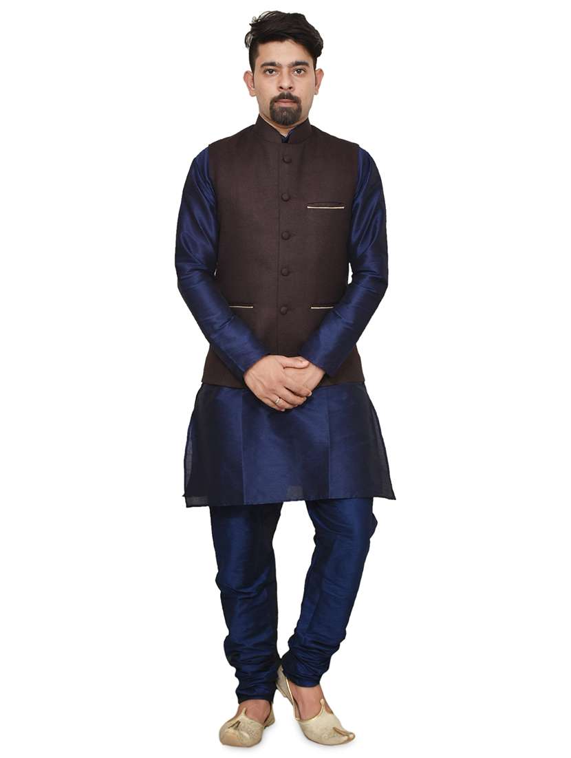 - » navy blue silk blend kurta pyjama with jacket ethnic wear set