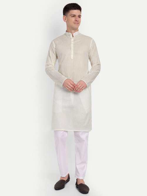 Men's Off-White Striped Kurta with White Cotton Pant