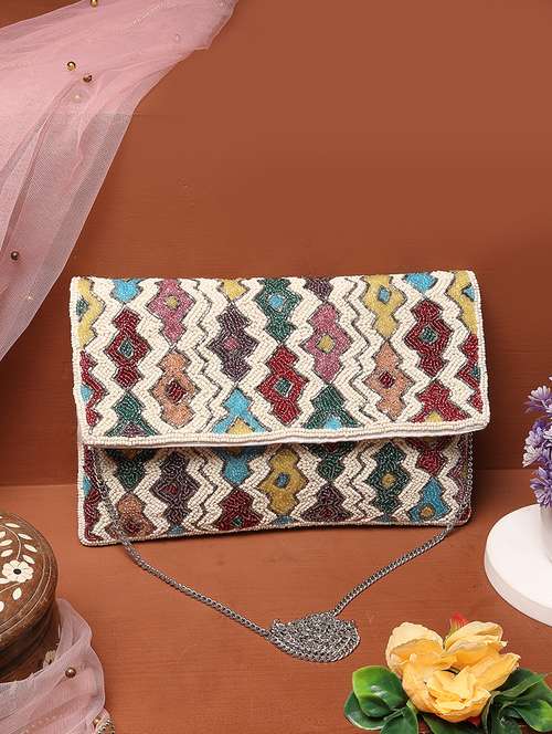 Ivory & Multi Sling Bag from Anekaant's Kooky Collection. Crafted with Cotton Canvas fabric, this Sling Bag features a Fret Embellished Pattern. It has 1 main compartment secured with a Button closure. It includes 1 Inner Patch Pocket. Has a detachable chain strap so you can carry it as a sling bag or a clutch. Dimensions (LxHxW) : 25 x 16 x 2 cm