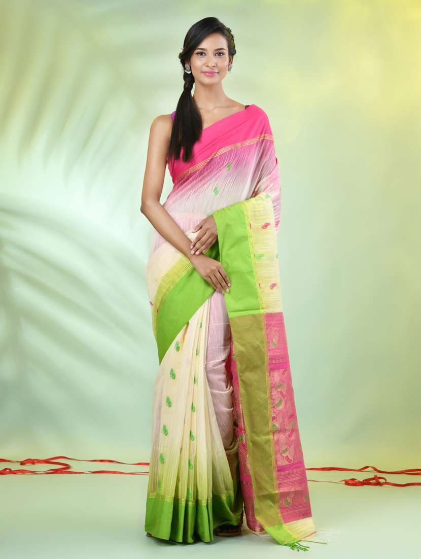 Drape yourself in the timeless elegance of our Off White Cotton Blend Ikat Saree With Ganga Jamuna Border, where comfort meets sophistication. Effortlessly versatile, it's the perfect blend of style and ease for any occasion.