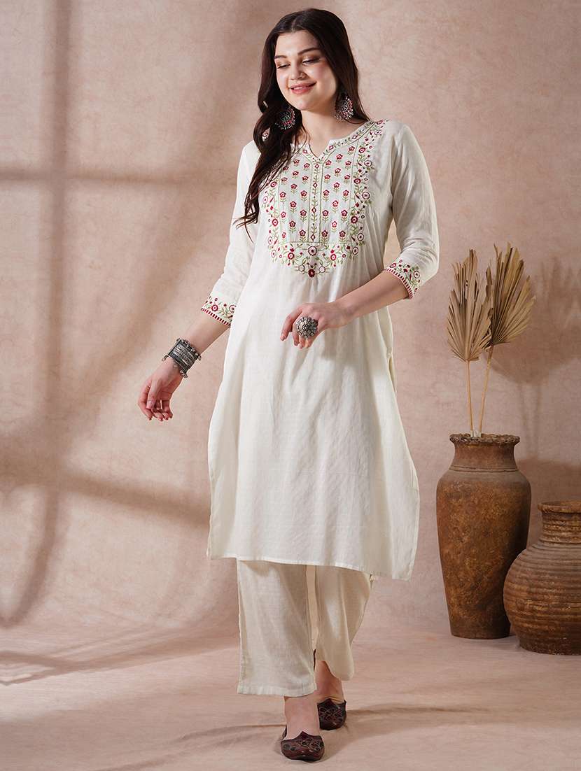 - Find gorgeous sets of ethnic wears in trending designs in off white colors suitable for casual wear of occasions.