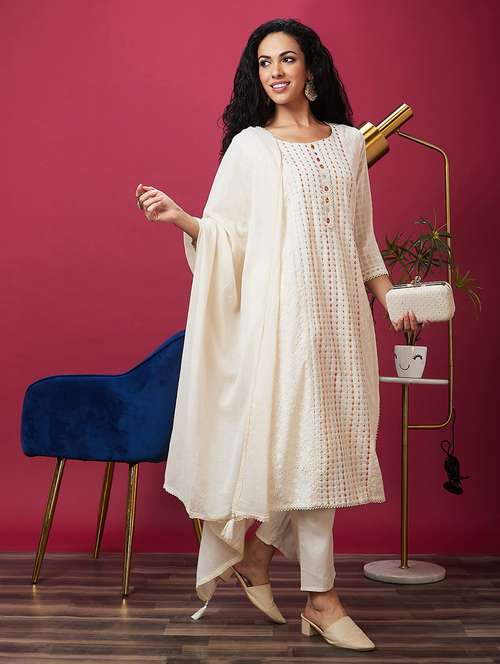 women white round neck kurta pant set with dupatta