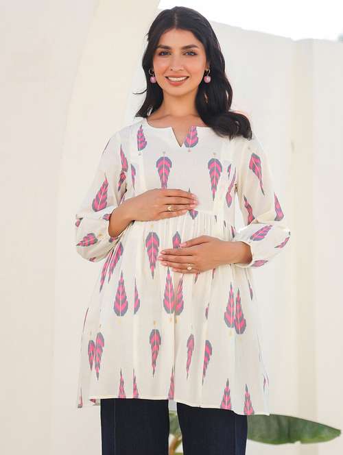 Designed for style and comfort, this white cotton a-line maternity tunic features a smart notch neck and vibrant multicolored ethnic motifs. The belly-hugging gathers featuring a side pocket under the yoke ensure a comfortable fit, while the discreet side zippers provide nursing-friendly functionality. Pair it with your favorite bottoms for a chic yet practical look, perfect for every expecting mother.