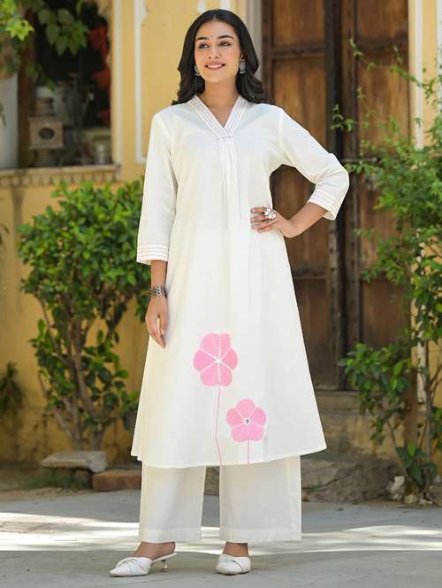 - Find gorgeous sets of ethnic wears in trending designs in off white colors suitable for casual wear of occasions.