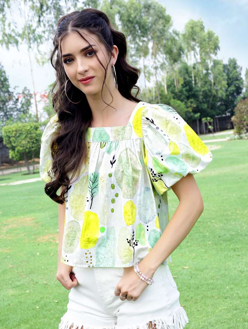 Baloon Sleeve Abstract Lime Print Summer Gen Z Top
