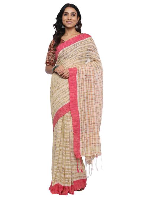 Offwhite saree with pink border and slub texture is perfect workwear and evening wear.