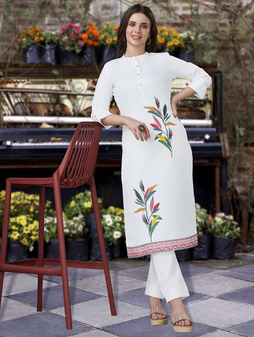 - Find gorgeous sets of ethnic wears in trending designs in white colors suitable for casual wear of occasions.