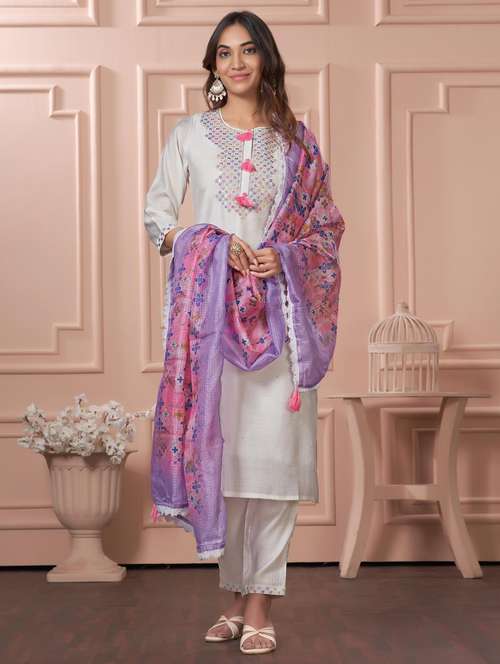 - Find gorgeous sets of ethnic wears in trending designs in off white colors suitable for festive wear of occasions.