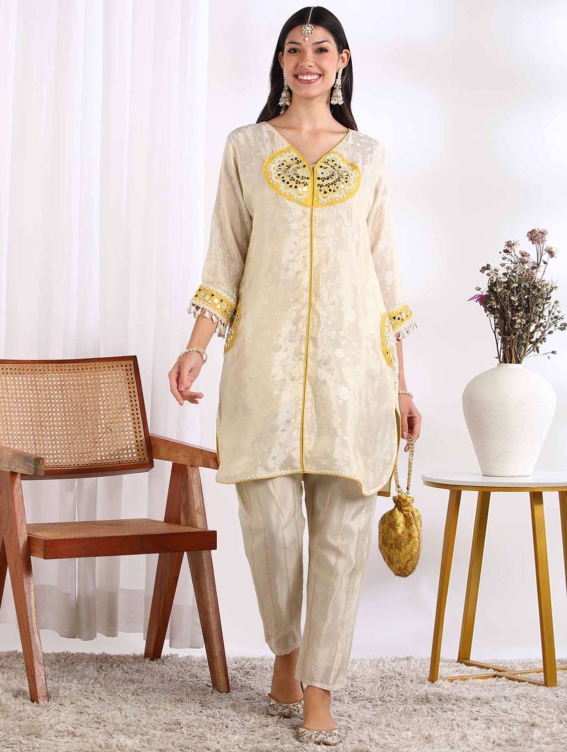 Viscose Jacquard Top & Pant, Mirror And Pearl Yoke With Piping, Dry Clean Or Gentle Hand Wash, Do Not Bleach