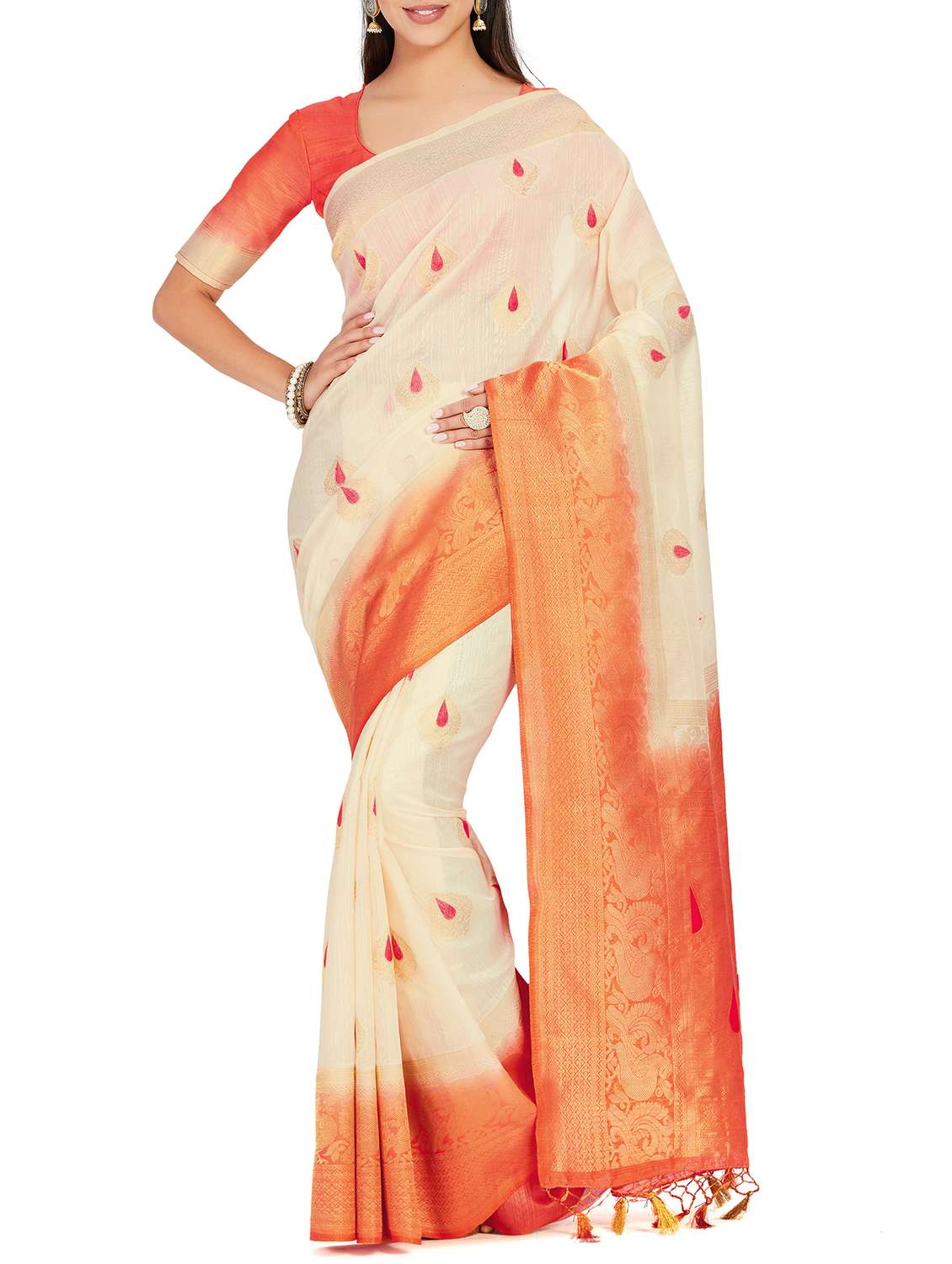 women's self design off white colored saree with blouse